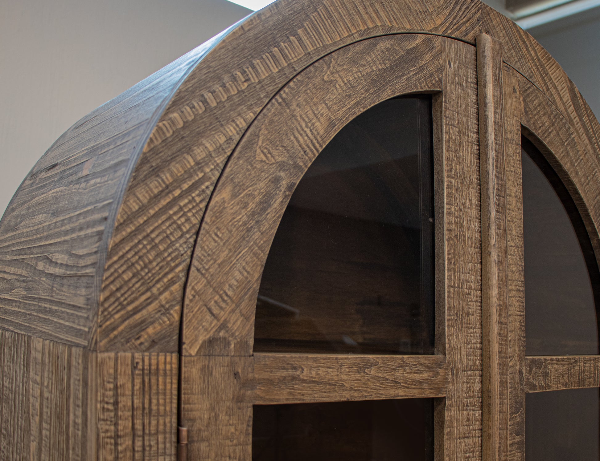 The glass doors feature magnetic catches for secure closure, while custom metal handles with a non-chip finish add a refined, modern touch. Thoughtfully designed, this cabinet offers both stylish display and practical storage, embodying the perfect balance of form and function.